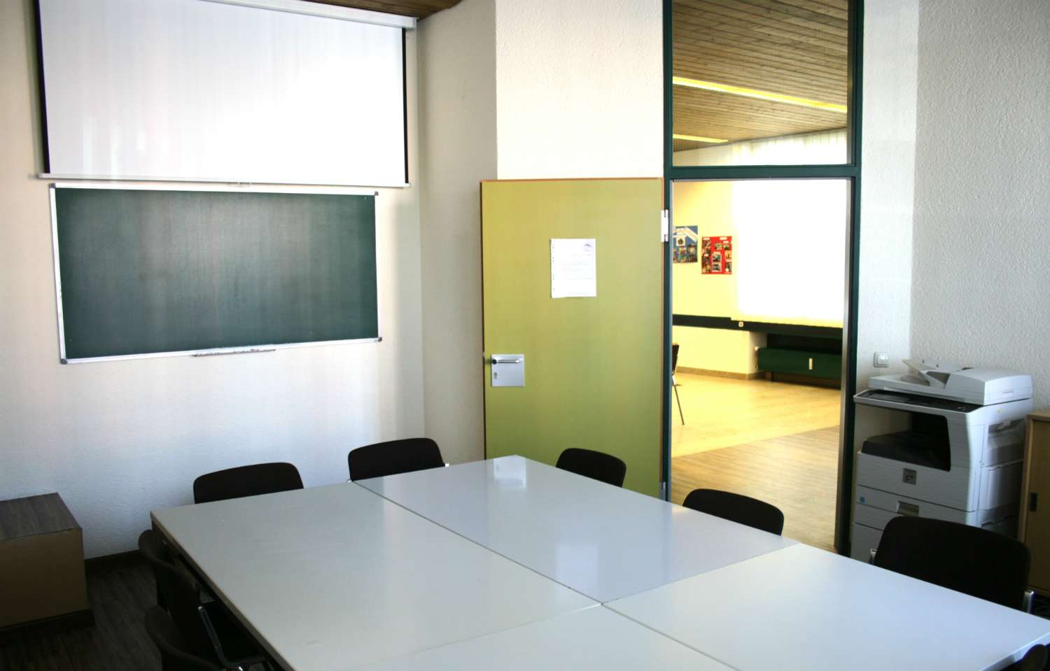 In unserem Seminarraum steht für die Kurse ein Kopierer, ein Beamer, eine Leinwand, ein DVD-Player, eine Schultafel und ein Internetanschluss zur Verfügung.